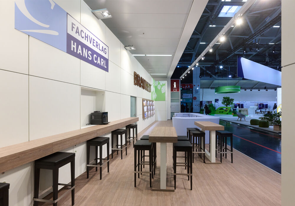 Für die diesjährige drinktec wählte der Aussteller eine neue, besucheroffene Standfläche direkt am Laufweg des Publikums. Die Herausforderung: hallenbedingt musste die bisher übliche Standhöhe reduziert werden. Dank der modularen Struktur des Systems konnte das Konzept jedoch problemlos angepasst werden – nachhaltig, kostensparend und mit den bereits vorhandenen Bausteinen und Möbeln.