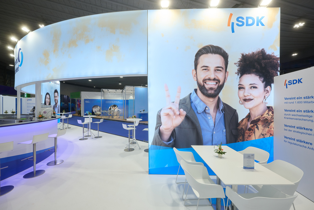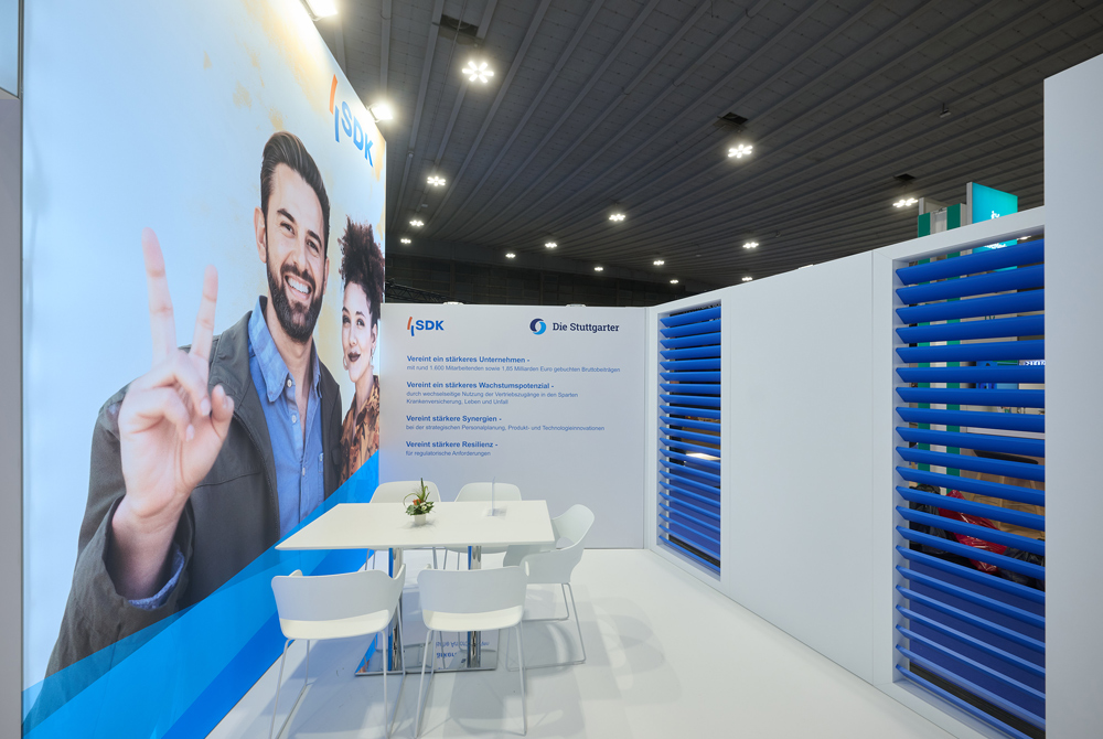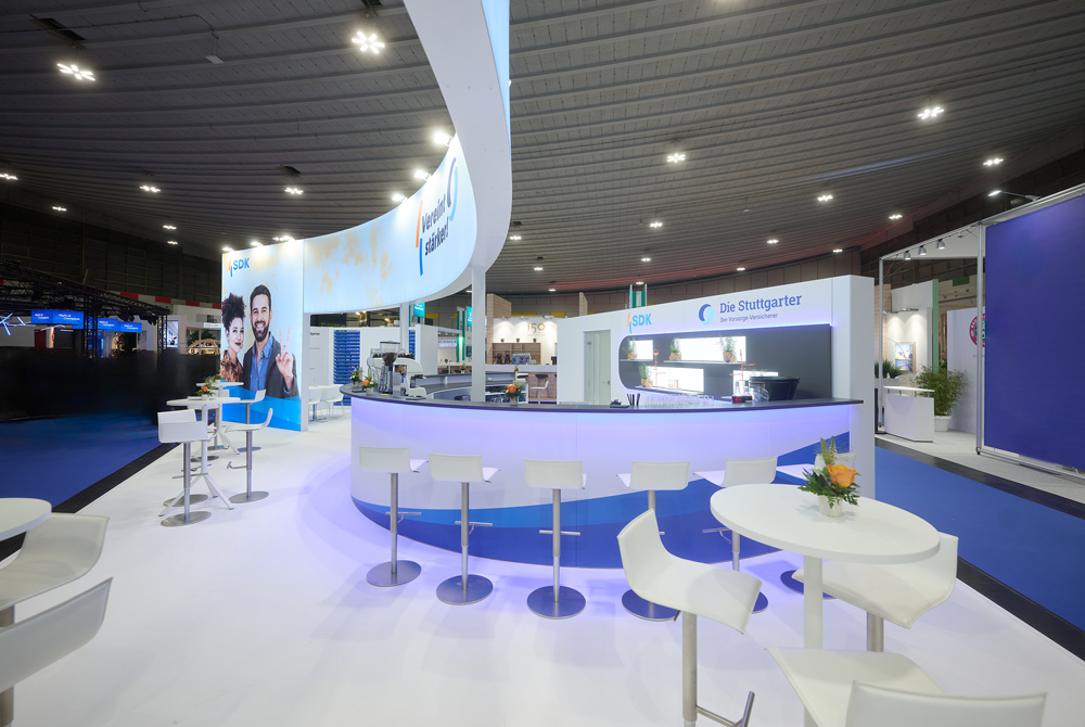 Mit einem modernen, allseitig begehbaren offenen Standkonzept hat unser Team auf der diesjährigen DKM in Dortmund einen eindrucksvollen Markenauftritt für die Stuttgarter Versicherung und die SDK realisiert. Beide Unternehmen präsentierten sich klar erkennbar in ihren Markenidentitäten – und zugleich als starkes, visuell verbundenes Duo.